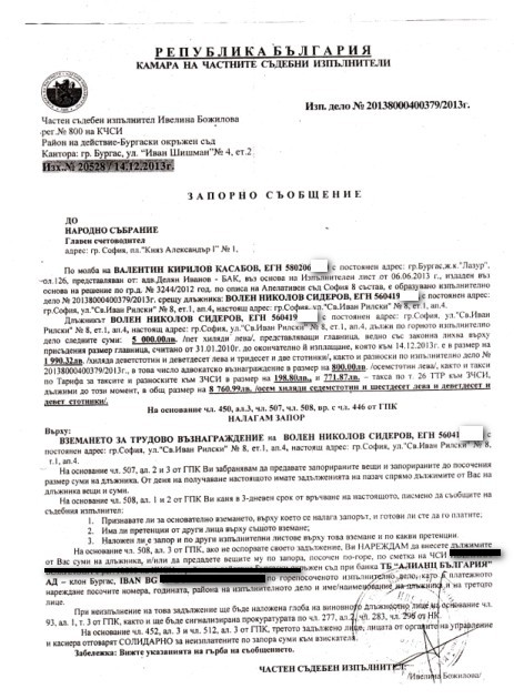 Заплатата на лидера на партия „Атака“ Волен Сидеров е запорирана, защото въпреки, че е осъден да плаща обезщетение, не е дал нито стотинка и е натрупал солидни лихви. Той е осъден заради обидни изявления във вестник „Уикенд“ в броя от 31 януари 2010 година срещу съпредседателя на НФСБ и водещ на предаването „Паралакс“ по ТВ СКАТ Валентин Касабов.