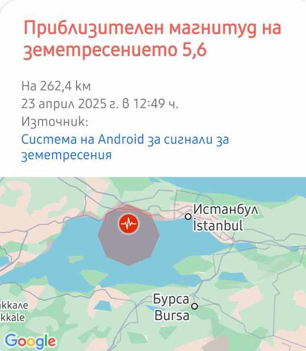 Земетресението започна в 12:50 часа и продължи около 30 секунди. Епицентърът е в Мраморно море, магнитут 6.2 по Рихтер. Очаква се в Истанбул да има сериозни разрушения по инфраструктурата.
