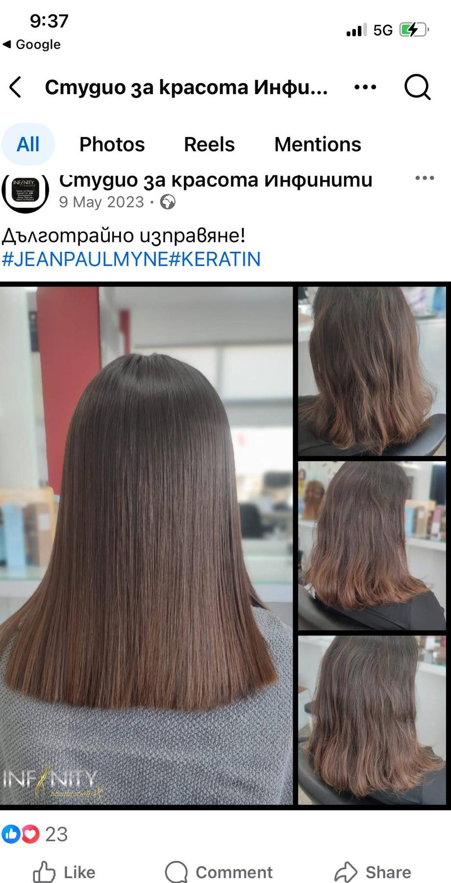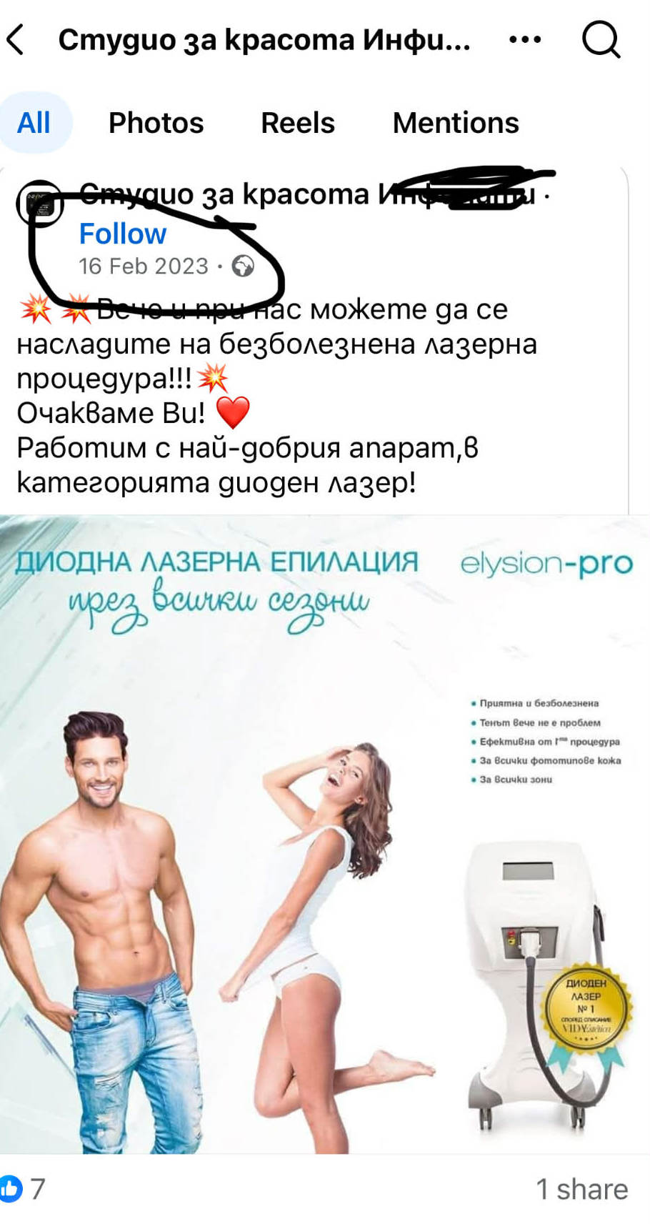 Салонът се рекламира във Фейсбук като фризьорски и за разкрасителни процедури на лице. Само ако разровите много по-надолу - ще видите, че от 2023 г. предлага иновативна технология с диоден лазер.