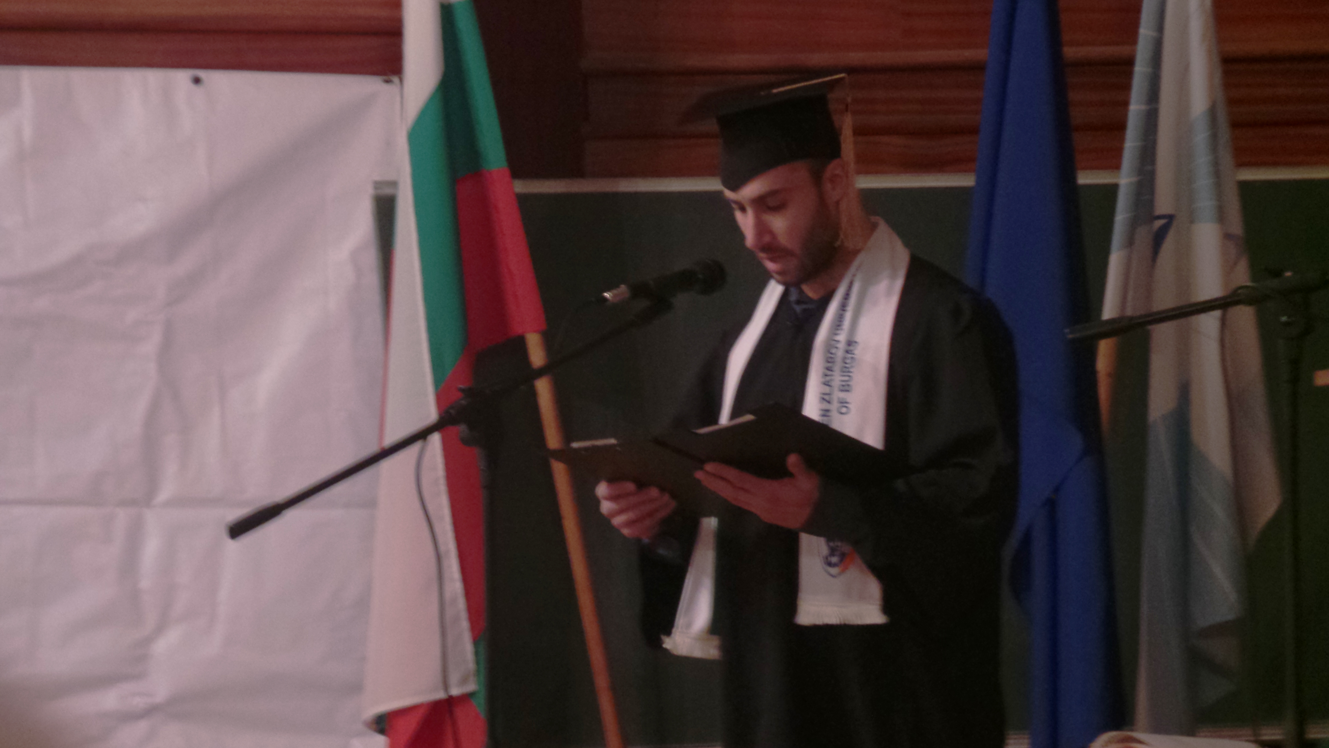 Преди раздаването на дипломите с тържествена реч един от най-изявените членове на ОЗБГ и дипломант магистър Стефан Петров, произнесе клетва.