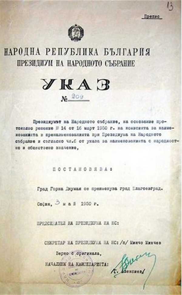Указът, с който Горна Джумая става Благоевград