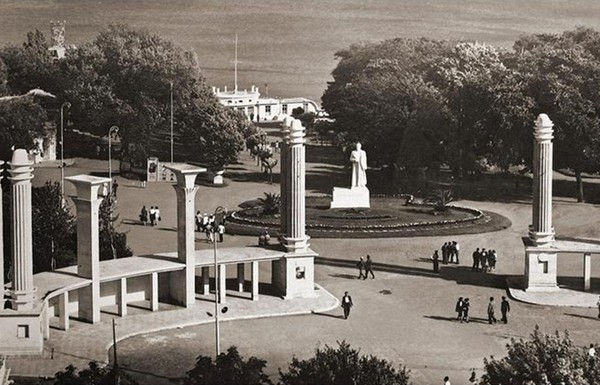 Снимка от входа на Морската градина във Варна от началото на 50-те години със статуята на Сталин