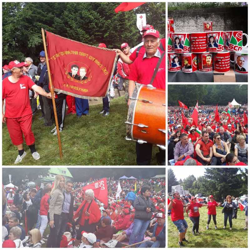 А горе на поляната първите дошли разтвориха софрите. Вестник и върху него хляб, салам, домати и ракия. Наздраве за БСП, се чуваше от всички страни. Имаше и тъпани, и знамена и хоро. Както и малки чавдарчета. Забелязваше се и разнообразие от послания върху червени фланелки.