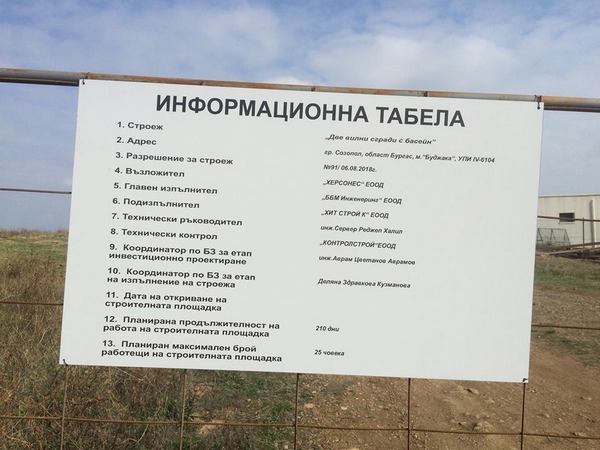 Поставената от работниците информационна табела указва, че възложител на строежа е едноличното дружество "ХЕРСОНЕС", а главен изпълнител на строителните дейности ще е "ББМ Инженеринг" ЕООД. Строежът ще представлява две вилни сгради с басейн.