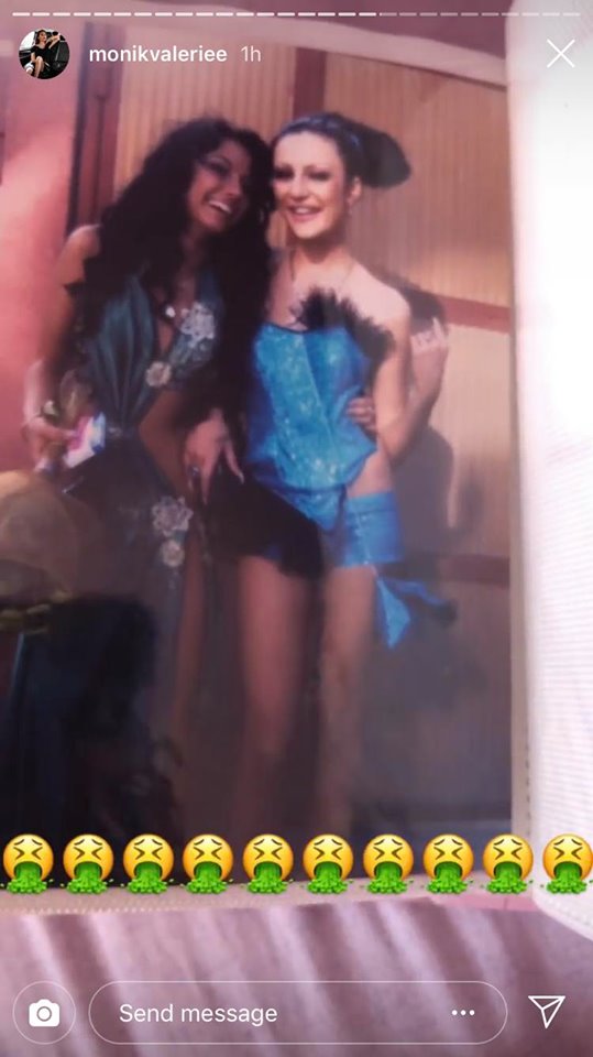 Тя обаче не укори по никакъв начин стила си на обличане, въпреки че мъничко парче син плат едва-едва покрива само най-милото й, а надолу се спускат дългите й голи бедра. Това не е всичко. Корсетът й също не крие много от нея, а една от паласките й лъсва изпод него.На кадъра тя позира с приятелка, която също не е кой знае колко облечена, но на фона на Моника си изглежда навлечена до уши!