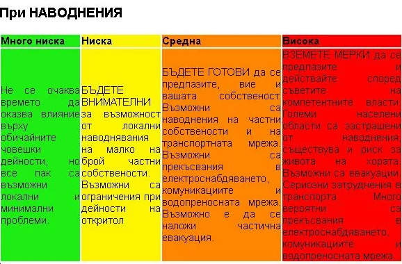 В таблиците по-долу са посочени примери какъв вид поражения могат да се очакват при всеки вид опасно явление (дъжд, сняг, вятър и др.) и всяка степен на опасност (висока, средна и ниска). Тя дава също някои общи съвети, които биха помогнали да се намалят или ограничат въздействията. Имайте предвид, че и при време "без опасни явления" е възможно да има някакви минимални негативни последствия.