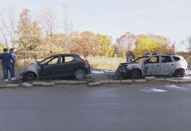 Колите са напълно унищожени. На блока, срещу който са паркирани, има и надпис със заплаха, в който се съдържа конкретна фамилия и напомняне за пари.