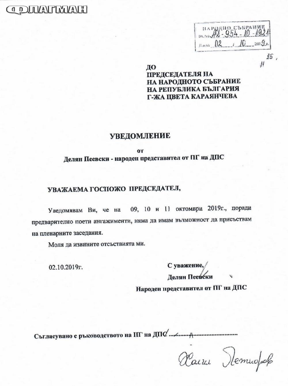 Например на 2 октомври 2019 г. Делян Пеевски пише: „Уведомявам Ви, че на 09, 10 и 11 октомври 2019 г., поради предварително поети ангажименти, няма да имам възможност да присъствам на пленарните заседания. Моля да извините отсъствията ми.“