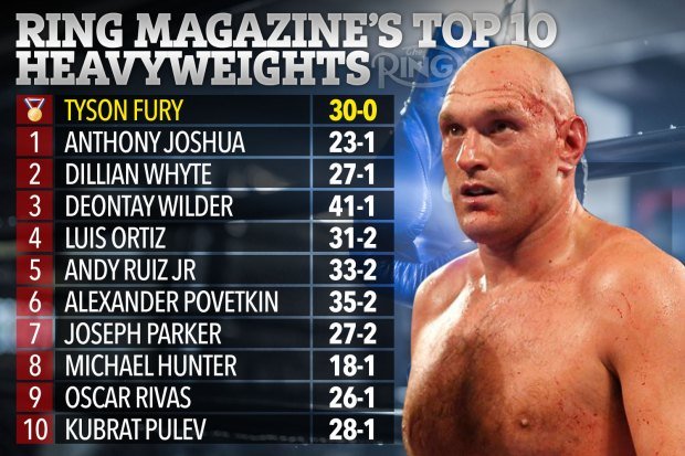 The Ring поставя на първо място световния шампион на WBC Тайсън Фюри. Британецът е единственият в тази класация, който няма нито едно поражение до момента в кариерата си. На втора позиция е бъдещият противник на Кобрата - Антъни Джошуа (23-1), който държи останалите значими титли. Трети, изненадващо за мнозина, застава Дилиън Уайт (27-1), който допусна единствената си загуба именно от Ей Джей преди 4 години. Той трябва да срещне Александър Поветкин, но все още няма дата за двубоя.