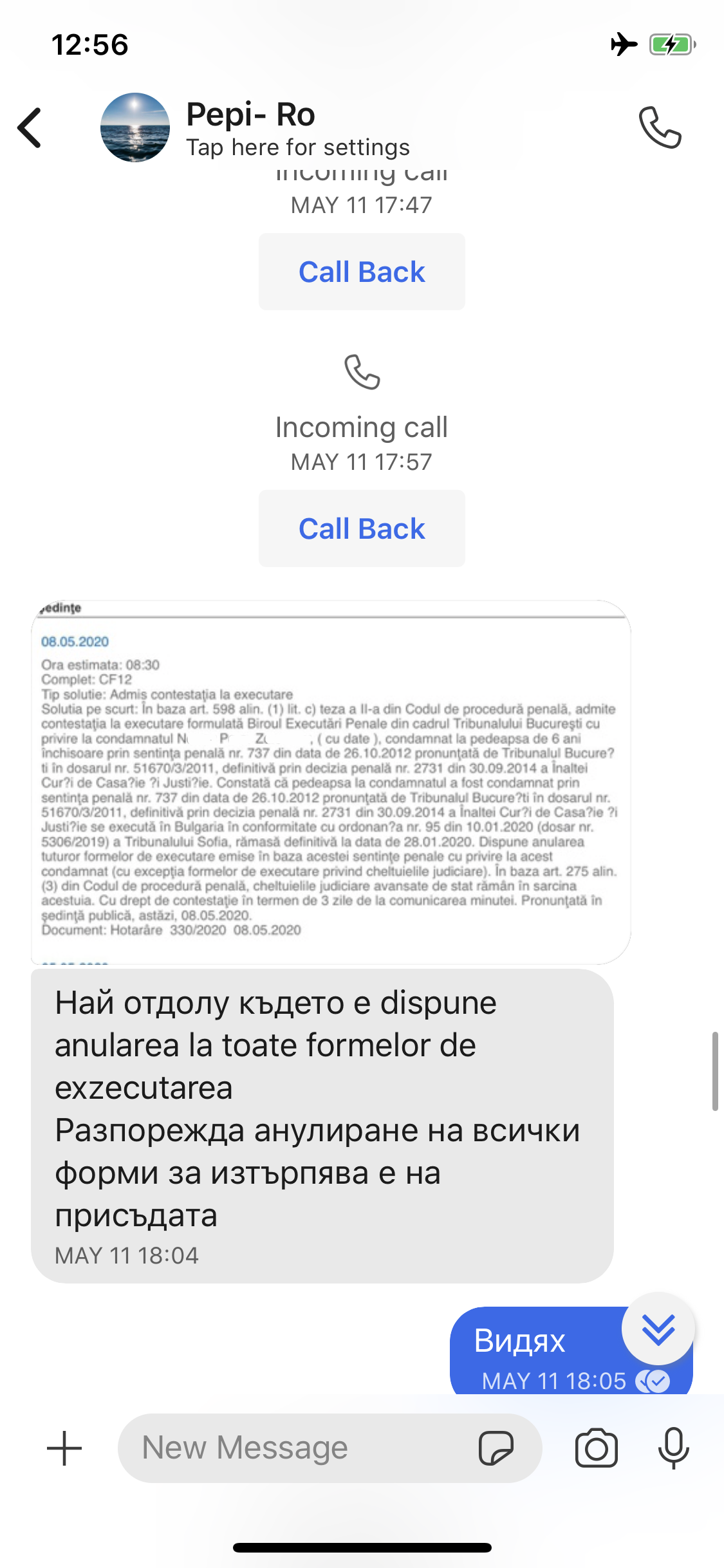 На 11 май 2020 г. “Pepi- Ro” изпраща на П.Б. снимка със съдържание на чужд език, касаещо решение на румънските съдебни власти. На 12 май 2020 г. в 12.10 ч. П.Б. препраща снимката на „Prezident-Pl. Uzunov“. В 12.13 ч. П.Б. пише на „Pepi- Ro” съобщение със следното съдържание: „Трябва официално извлечение от румънския съд и превода му на български!“