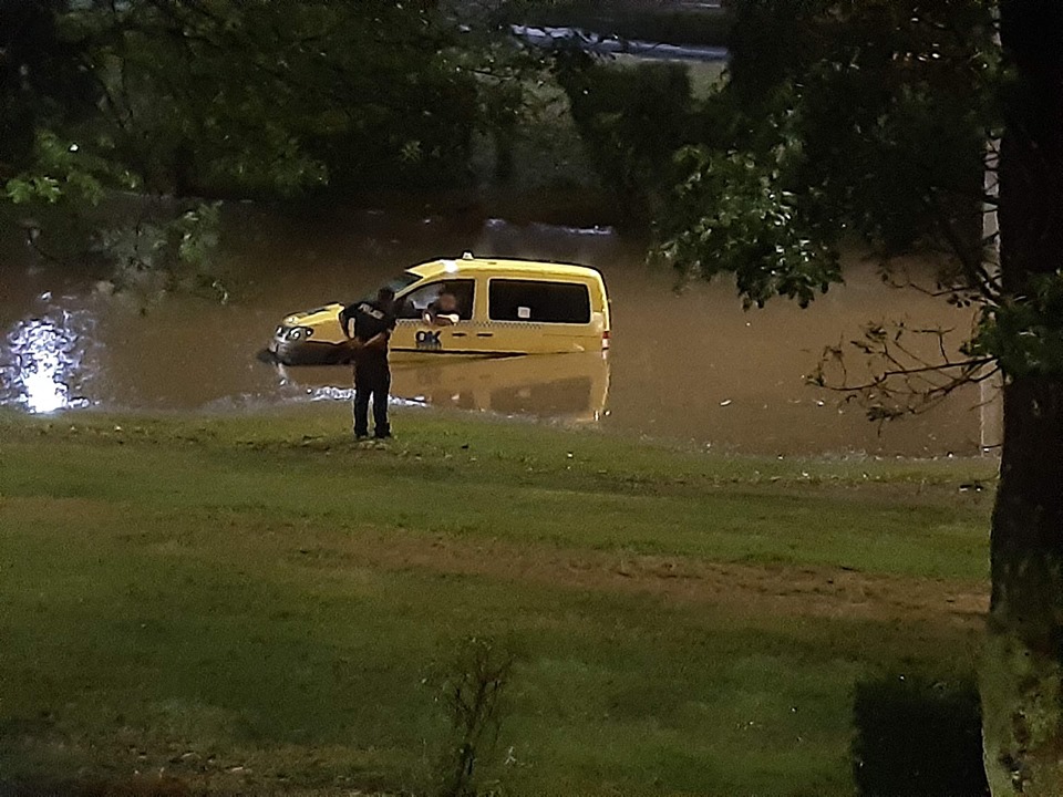 Под надлеза зад Националния дворец на културата булевард "България" се е превърнал в блато. Две таксита са затънали във вода, едното от тях почти цялото покрито.