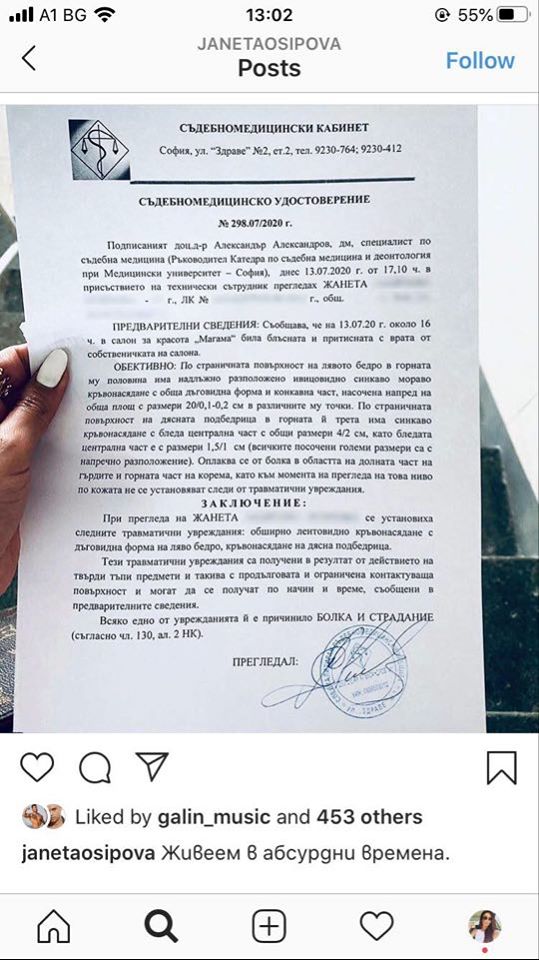 "Живеем в абсурдни времена. Днес “коафьорката” и собственик на салон за красота “МАГАМА” ме преби в собствения си салон, като преди това ме заключи и ми отказа възможност да напусна сградата. Причина за побоя и унижението бе моята спокойна и възпитана молба да бъда компенсирана за фалшив продукт, неотговарящ на описанието, също така – напълно нов! Чувайки тази моя молба, въпросната дама избухна в ярост и ме заключи в салона, след което ми нанесе трайни физически и психически вреди“, написа Мис Плеймейт Жанета Осипова.