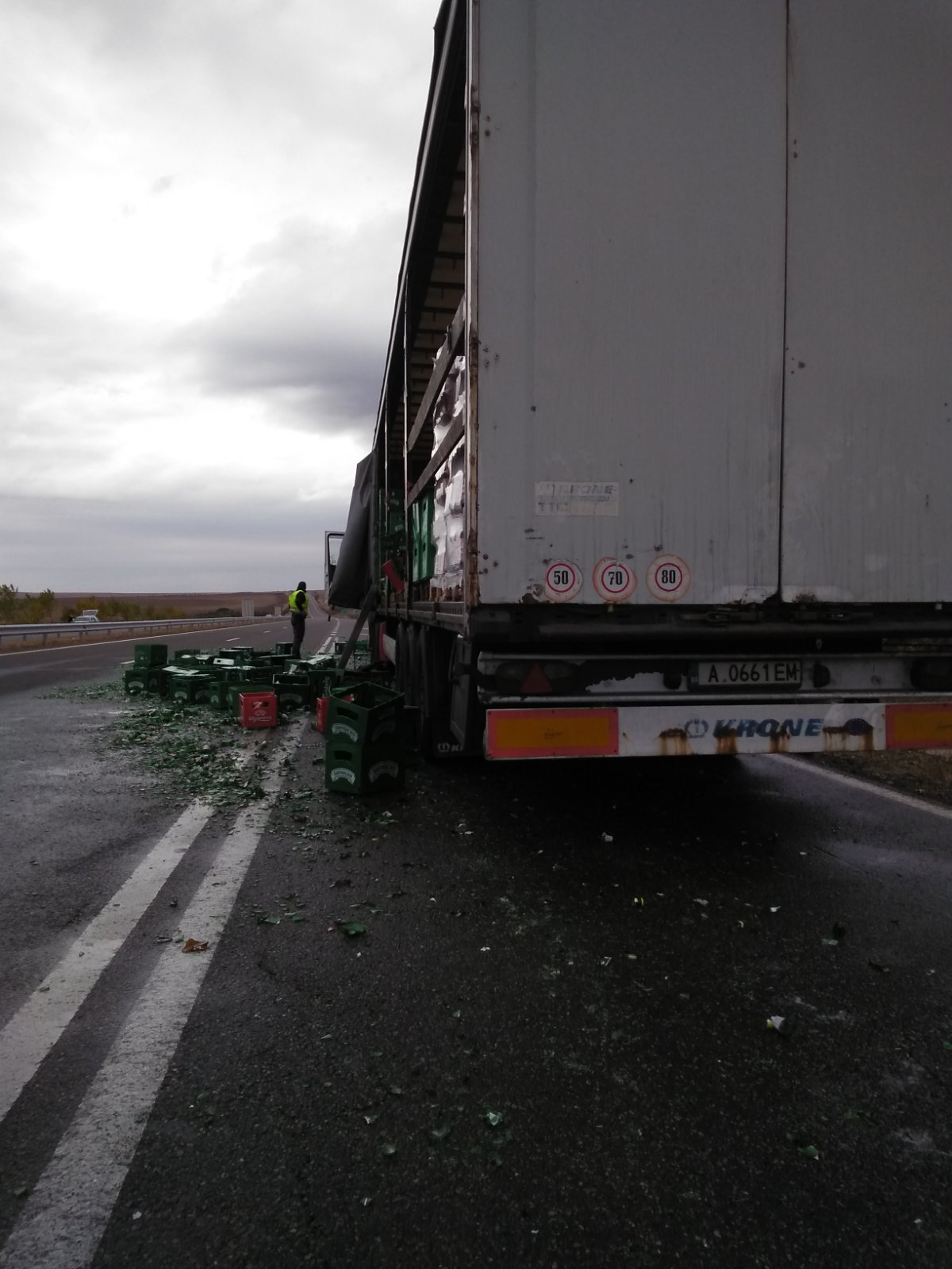 Товарният автомобил тип влекач разсипа товара си си от каси с бира на детелината на АМ "Тракия" в посока София, в района на изхода от Карнобат. . Касите с бира в момента са на пътното платно на автомагистралата. Към мястото е насочен екип на пътна полиция, който ще затвори за движение автомагистрала “Тракия” в частта на инцидента, като пренасочи трафика през: детелината на “Тракия” вход Карнобат - западен обход - пътя Карнобат - венец - Петолъчката.