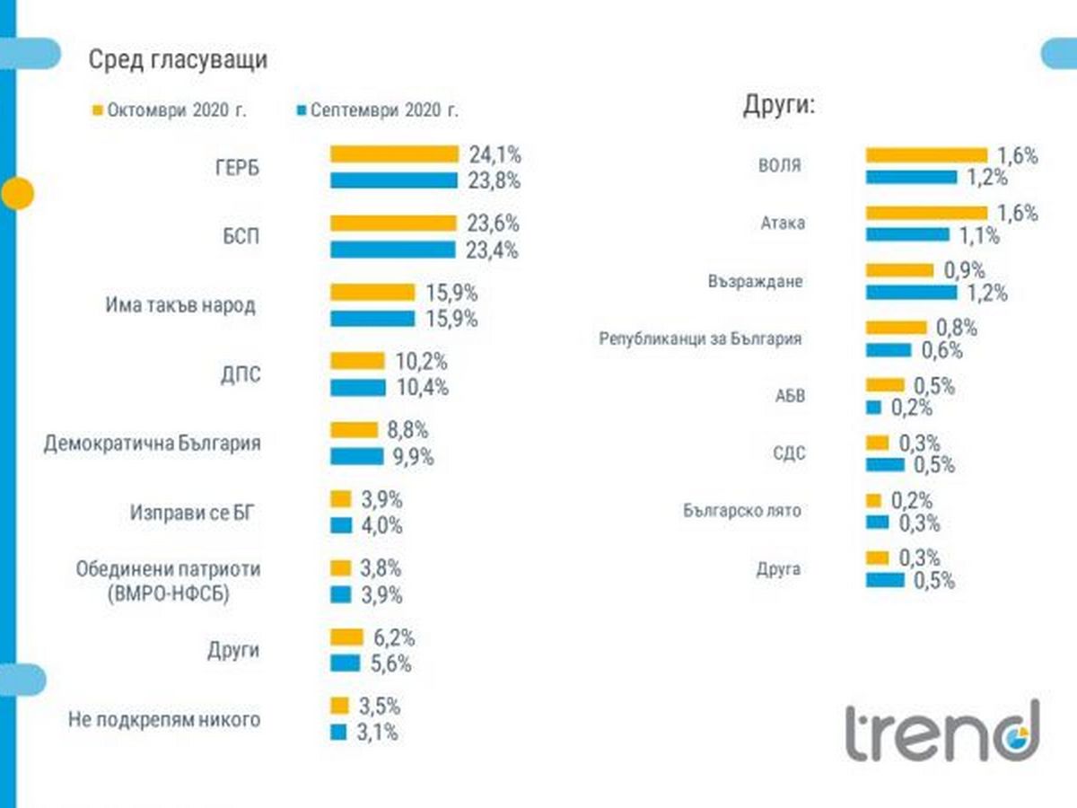 На парламентарните избори ГЕРБ и БСП ще излязат с изравнена подкрепа, двете партии са в практически паритет, показва национално представително проучване на “Тренд”.