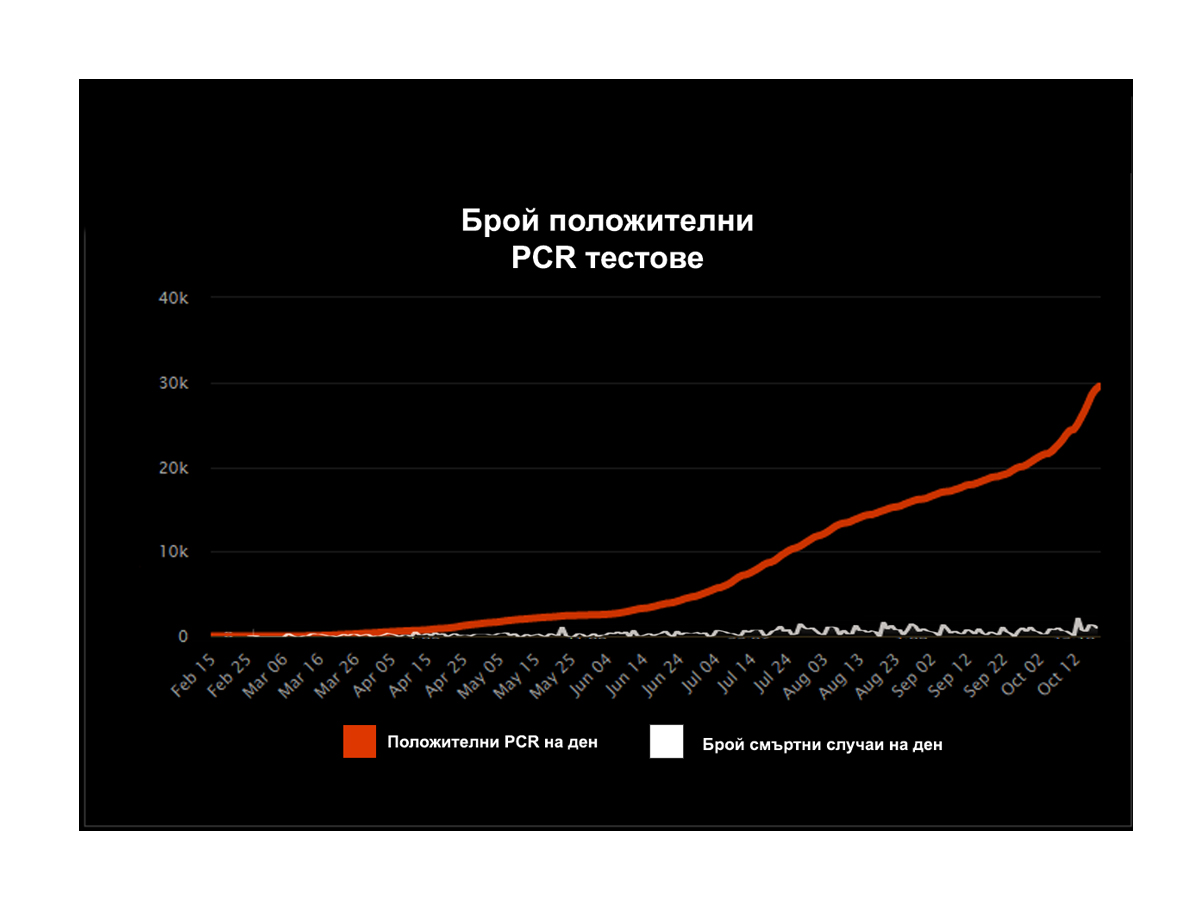 За последните 2 седмици – от 5 октомври до днешния празник на лекарите – броят на активните случаи в страната се е завишил двойно от около 5800 до около 11 500. В същото време обаче, за разлика от предходния показател, броят на смъртните случаи не се движи експоненциално нагоре, а запазва линейност. Според експерти това може би означава, че или вирусът, циркулирайки вече повече от половин година сред обществото, е започнал да отслабва, или бройката на положителни, но безсимптомни, е драстично по-голяма от тази, която към момента наблюдаваме. Това пък от своя страна значи, че реалната смъртност от вируса е с драстично по-ниска от обявената към момента на база положителни проби/смъртни случаи такава от около 3%.