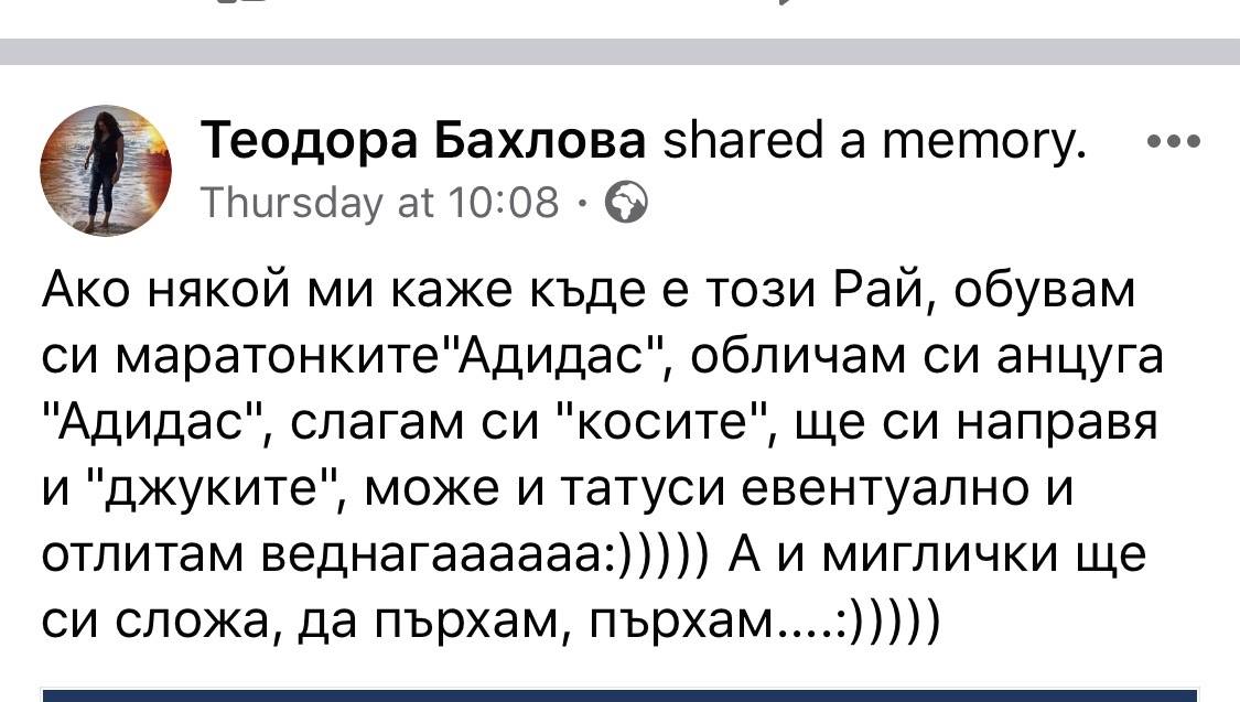 Недоумение буди и пост от по-рано в четвъртък, в 10:08 часа, в който отправя следното послание на стената си: „Ако някой ми каже къде е този Рай, обувам си маратонките "Адидас", обличам си анцуга "Адидас", слагам си "косите", ще си направя и "джуките", може и татуси евентуално и отлитам веднагаааааа:))))) А и миглички ще си сложа, да пърхам, пърхам....:)))))"