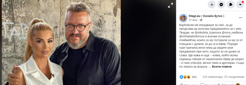 Популярната дизайнерка Миглена Каканашева-Мегз излезе със скандални разкрития за Мартин Карбовски, с когото си партнираха в ефира. Бизнесдамата твърди, че журналистът я изнудвал за секс, за да продължи да излъчва предаванията си с нея. Меглена Каканашева обяви публично, че Карбовски се е срещал с президента Румен Радев, а след това, по нейните думи, в пияно състояние, си е признавал, че е взимал пари от държавния глава, за да руши имиджа на премиера Бойко Борисов. Мегз намесва имената и на плеймейтките Николета Лозанова, Нора Недкова и Михаела Тодорова.