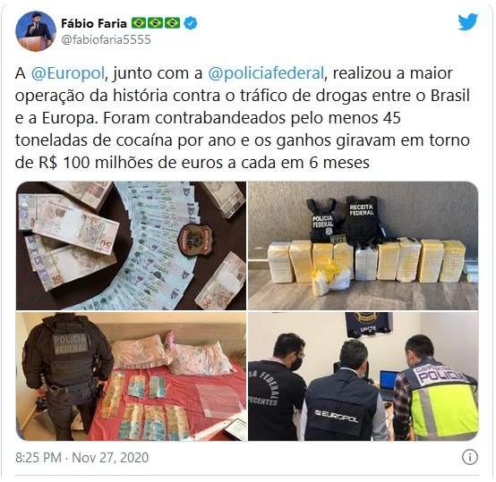 Представители на Европол съобщиха на пресконференция в Хага, че с участието на около 1000 полицейски служители са били обискирани 180 адреса. Това е най-мащабната съвместна операция на Европол и полицията в Бразилия от подписването на договора за сътрудничество между организацията и бразилската страна през 2017 г. В резултат на обиските в латиноамериканската страна са запорирани 37 самолета и 160 недвижими имота, пише Лупа