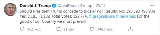 А самият Тръмп пък направи мини социологическо допитване в профила си в Туитър – да сдам ли властта или да не я сдавам. 98,9% гласуваха с „не“.