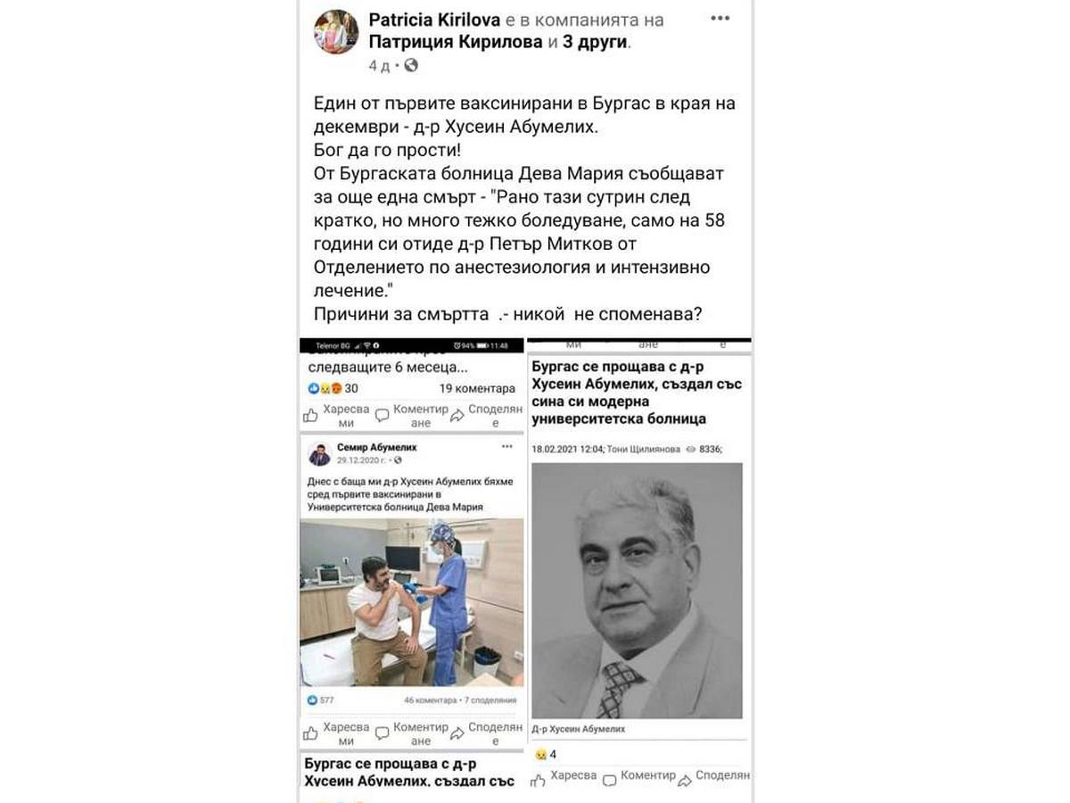 Сред най-активните разпространители на фейка е Патриция Кирилова, бивш журналист от в-к. „Нощен труд“, настоящ блогър и изявен антиваксър. „Един от първите ваксинирани в Бургас в края на декември – д-р Хусеин Абумелих. Бог да го прости! От Бургаската болница Дева Мария съобщават за още една смърт – „Рано тази сутрин след кратко, но много тежко боледуване, само на 58 години си отиде и д-р Петър Митков от Отделението по анестезиология и интензивно лечение.“ Причини за смъртта. – никой не споменава“, пише дословно в поста си във фейсбук Патриция Кирилова. (запазен е оригиналният словоред и правопис, б.а.)
