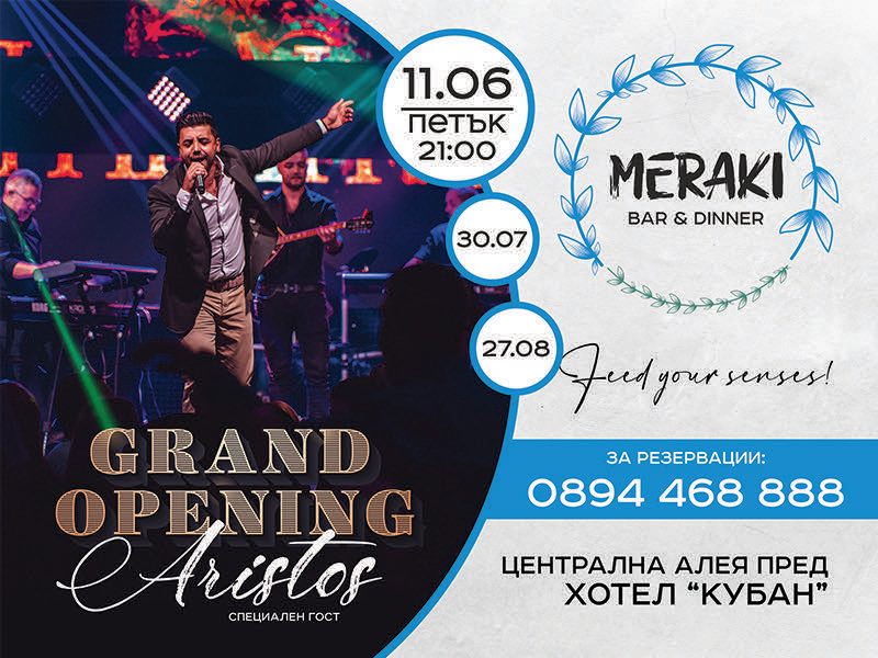 Грандиозен старт на сезона ще бъде даден на 11-ти юни петък с участието на култовия певец Аристос. Гръцките ритми ще са подобаващ фон за първия работен ден и на майстор сушистът в „Мераки“, който ще се старае да впечатли изтънчените ценители на тази кухня.