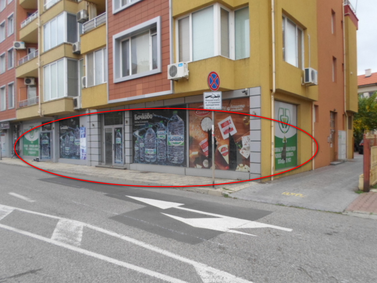 Обектът е изграден на партерните етажи на две съседни сгради, на калкан. Вътрешната стена е съборена, а имотите са обединени. Има голяма търговска зала, офис, две складови помещения, два санитарни възела, четири входа – два за клиентите и два в задната част за персонала, както и паркоместа във вътрешния двор.