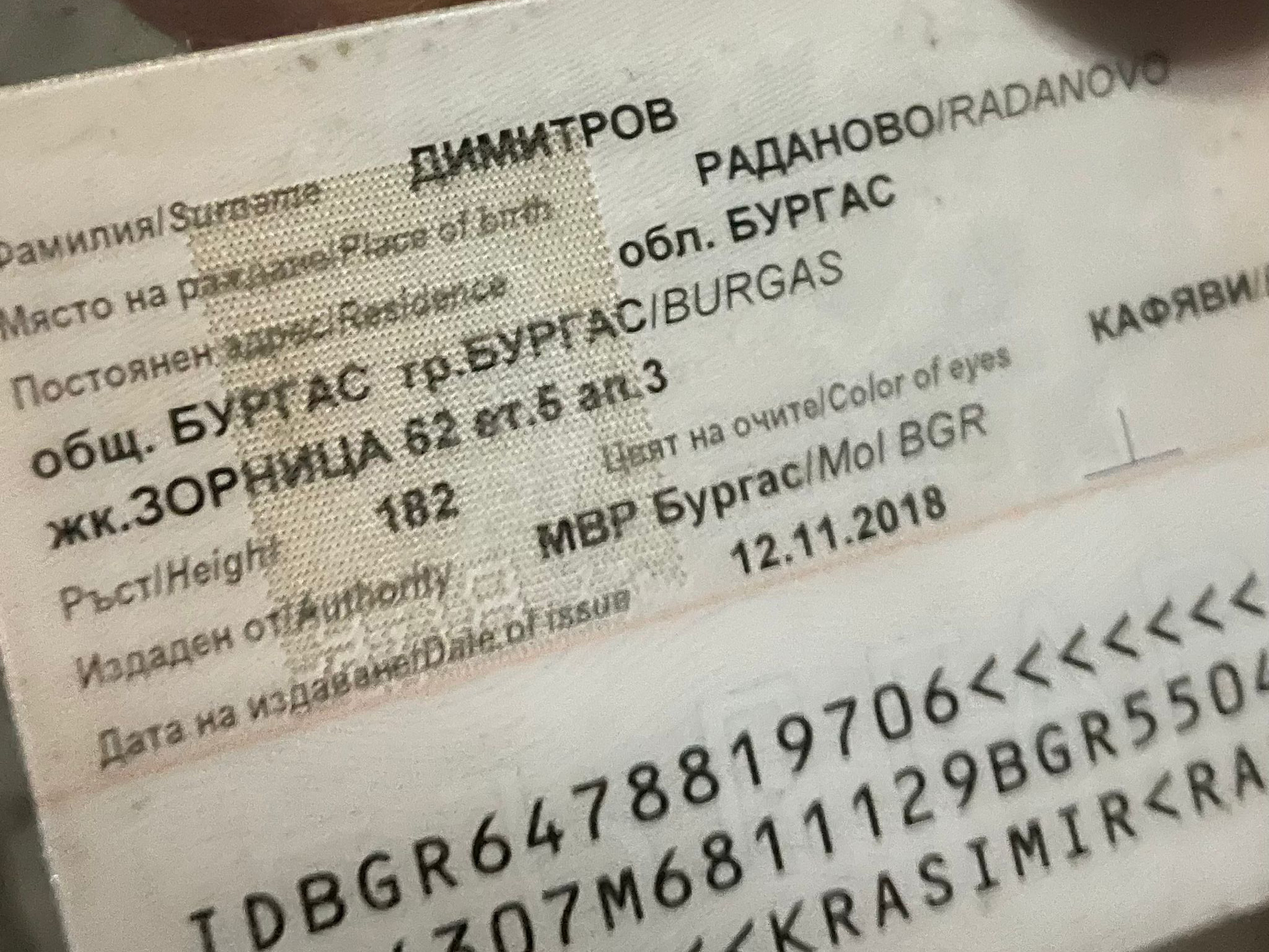 С този анонс Флагман насочва вниманието на ръководствата на ОДМВР-Бургас и Окръжна прокуратура, предстои да ви разкажем история, достойна за разтърсващ психотрилър. Само ще добавим още нещо към претенциите ни да бъдем коректни като журналисти в своето паралелно разследване на мракобесната същност на 56-годишния бизнесмен Станимир Рагевски. Вижте гърба на тази лична карта, с отразена адресна регистрация на Красимир Димитров – Бургас, жк. „Зорница“, бл. 62, ет. 5, ап. 3 – лобното място на Юмер Мехмед.