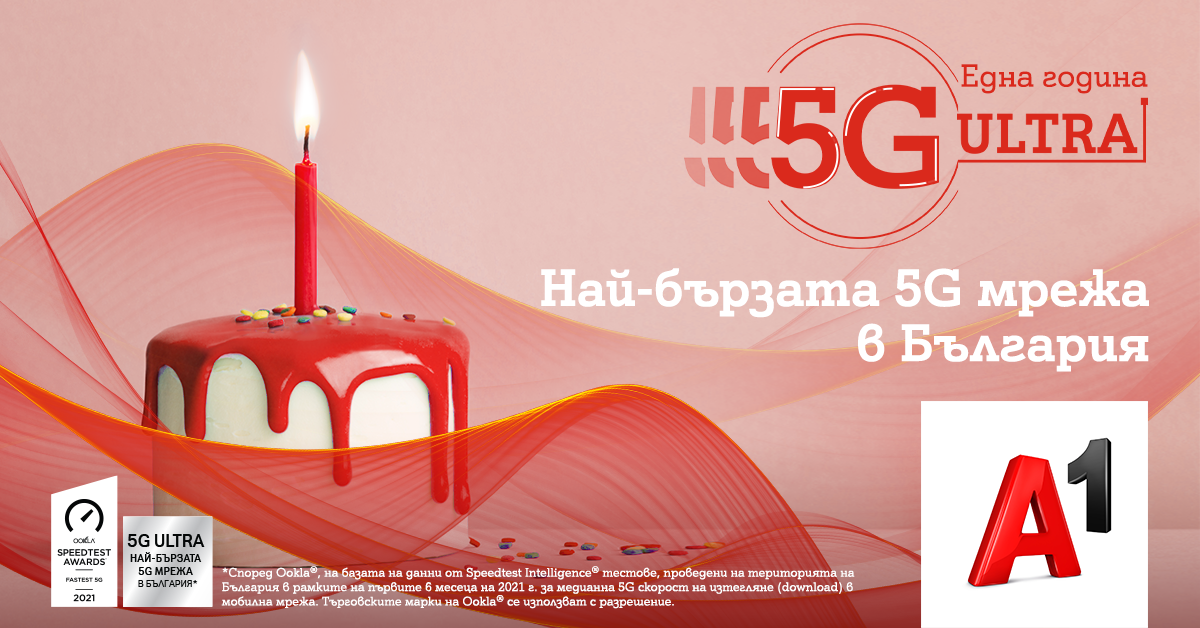 *Според Ookla®, на базата на данни от Speedtest Intelligence® тестове, проведени на територията на България в рамките на първите 6 месеца на 2021г. за медианна 5G скорост на изтегляне (download) в мобилна мрежа. Търговските марки на Ookla се използват с разрешение. Повече информация за тестовете и мобилната мрежа на А1: www.А1.bg.