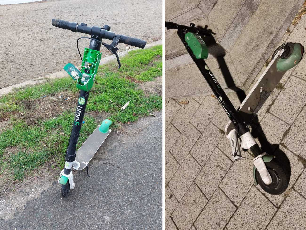 Първият случай е от крайбрежната алея на Северния плаж, където изглежда „недоволен клиент“ е решил, че най-лесният начин да се отърве от плащане на дължимата сума е като разбие намиращото се в предната част на тротинетката електронно устройство за верификация. По двуколката има и следи от удари, видно от предната гума, която е изкривена и спирачния механизъм, който е разбит.