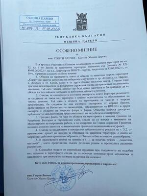 "Смятам, че единствената изготвена експертиза, която формира решението за създаване на такъв вид територия, е крайно недостатъчна за обосноваване на такова решение, тъй като в обхвата на територията се засягат и морски пространства. От това би следвало да има изготвена експертиза от морски биолог, представители на Института по океанология, представители на НИНКН и други експерти по морска флора и фауна. Отсъства широка дискусия, публичност и задълбочена експертност", заяви Лапчев пред наш репортер, който се намира в сградата на РИОСВ-Бургас към момента. Това е описано и в особеното мнение на Лапчев, което е входирано в РИОСВ-Бургас.
