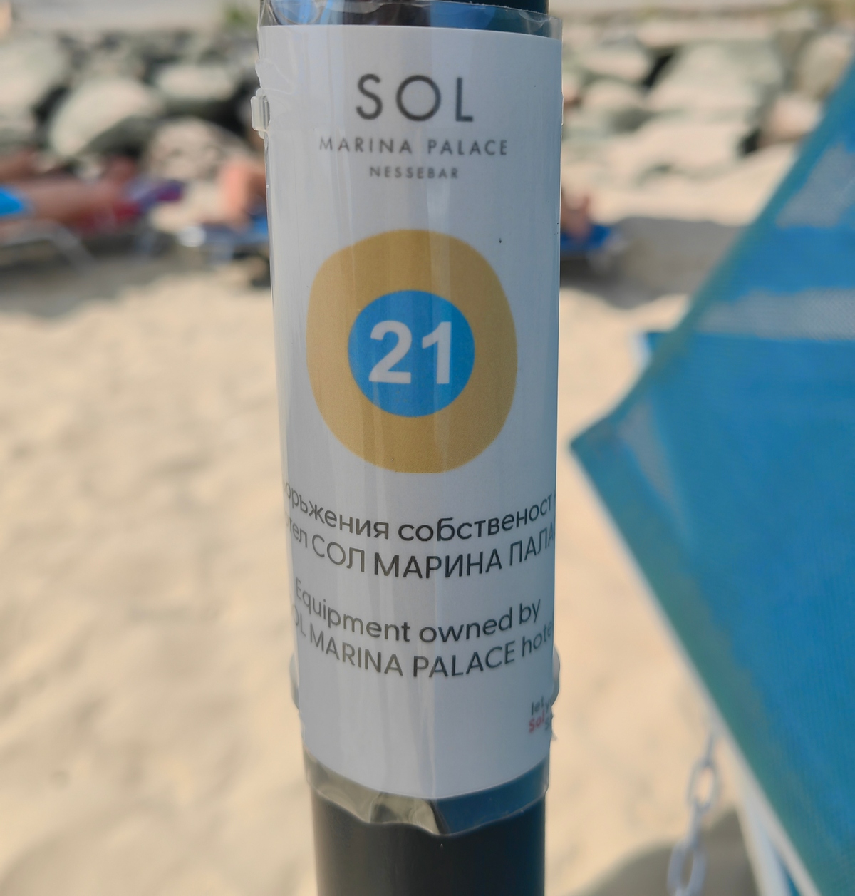 Големият проблем дойде от това, че са брандирани със знака на комплекса и е изписан следният текст: “Съоръженията са собственост на „Сол Марина Палас““. Чадърите имат и персонални номера – като маси за резервация.