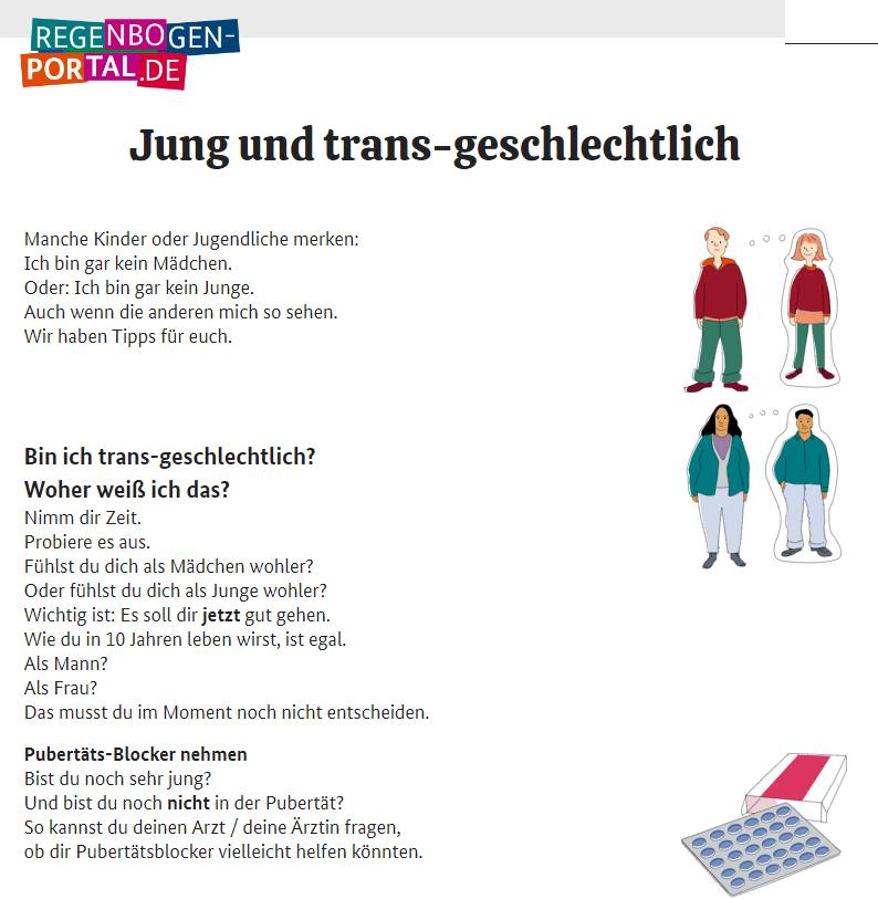 Портал, създаден от германското правителство, публикува конкретни указания към децата как да си изберат нов пол, ако сметнат, че сегашният не ги устройва. Там им е разяснено, че ако се колебаят, дори могат да спрат с препарати развитието си за известно време, и да отложат навлизането в пубертета, за да имат повече време за размисъл.