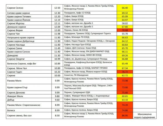Резултатите обаче показват, че от 48 марки сирене при 35 водното съдържание е над 60%, а от тях в 12 е дори над 70%. Един от продуктите - "Свежо сирене", произведен от Ракево Милк Трейд ЕООД, съдържа 86,95%, а друг продукт - "Даная", който се продава неопакован, съдържа 43% немлечни мазнини и струва 20,90 лв./кг.