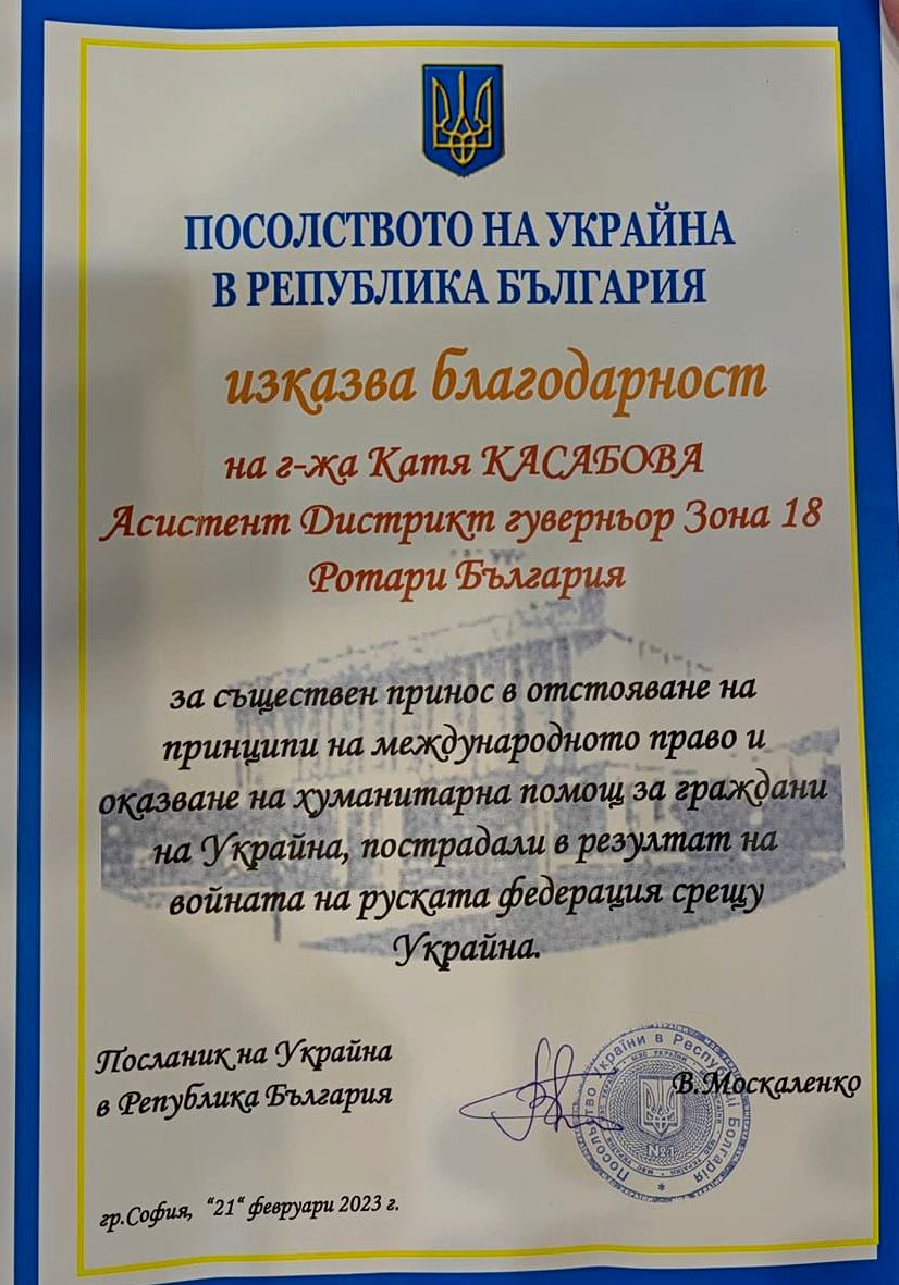 Изключителна благодарност за навременно проявен хуманизъм и значителен размер на оказаната материална помощ за хиляди майки и деца - храни, памперси, облекла, завивки, играчки и учебни пособия, посланик Москаленко е предал чрез Почетния консул за Ротарианската общност у нас, представлявана в региона от АДГ Катя Касабова.