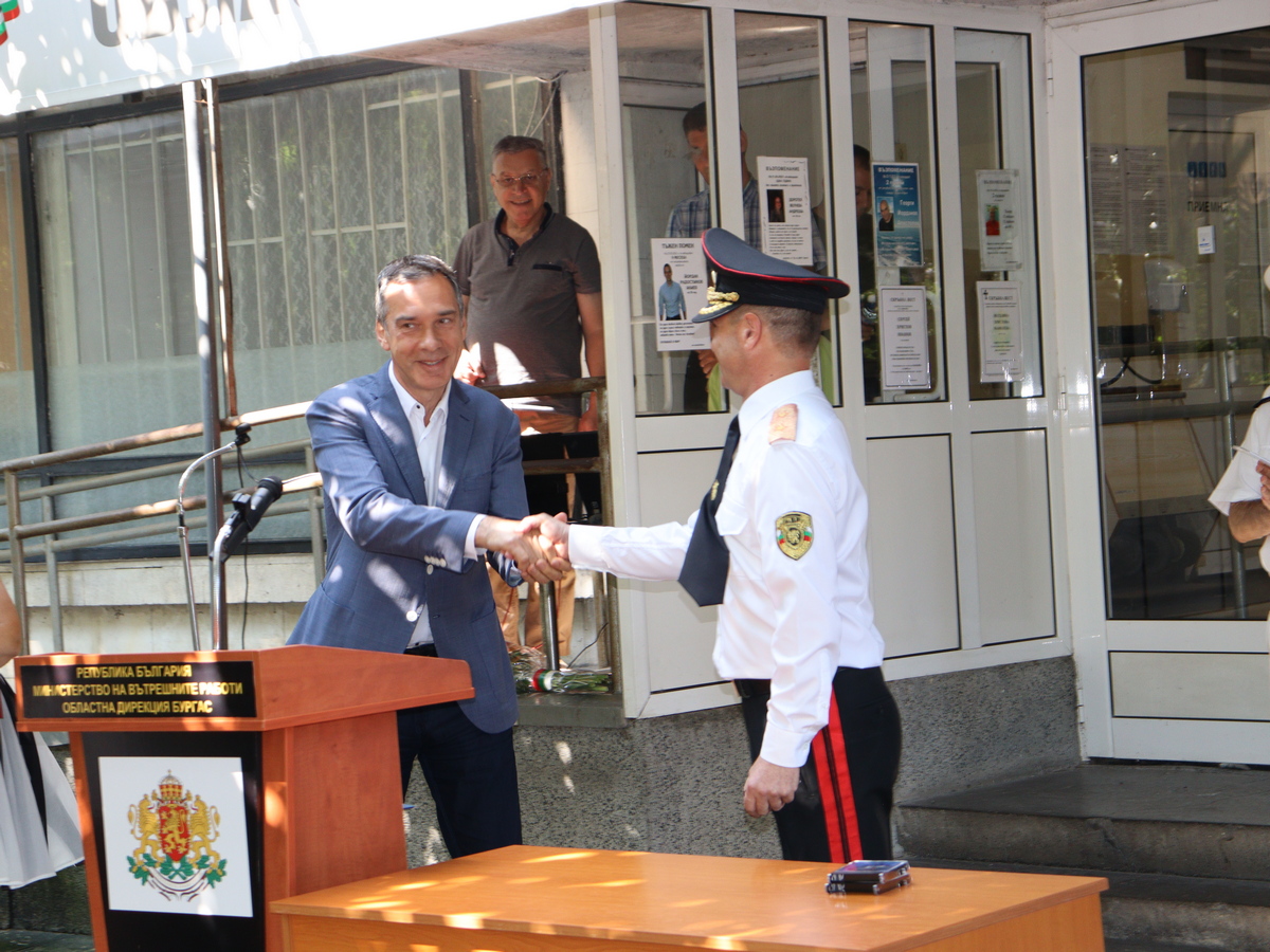 Навръх професионалния празник на всички работещи в структурите на МВР, Областната дирекция в Бургас се сдоби с нов лек автомобил, който ще бъде за нуждите на полицаите от Първо РУ. По време на тържествената церемония пред сградата на ОДМВР кметът на Бургас Димитър Николов връчи символично ключовете на директора старши комисар Калоян Калоянов.