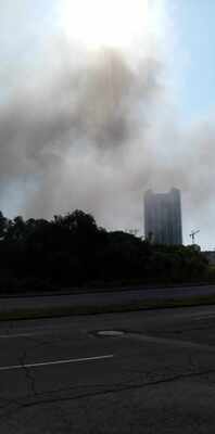 Гъсти кълбета черен дим се извисяват над комплекса.