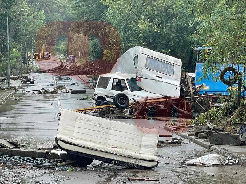 Това е мястото в Царево, където пороят отнесе трима души преди около 4 часа. Досега оглед бе невъзможен. Тук за последно са видени председателят на Районния съд в Царево Мария Москова и дъщеря ѝ, които са опитали да избягат с бял „Нисан Джук“. Виждат се и други отнесени автомобили. Мъжът, който се издирва, по данни на очевидци, се е опитал да се закрепи за затиснатия в кадрите бял джип, но водата е придошла изведнъж с още по-голяма скорост и го е отнесла в морето. На място е и директорът на ОДМВР-Бургас старши комисар Емил Павлов, който лично е поел разследването.