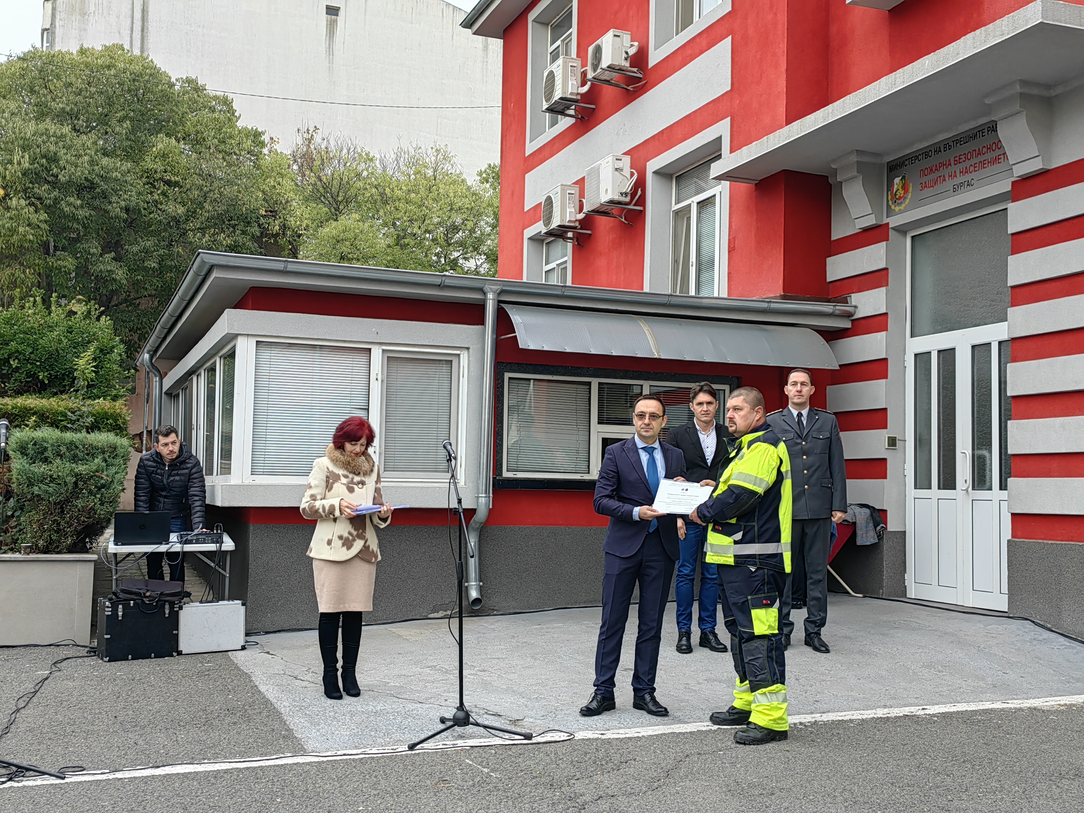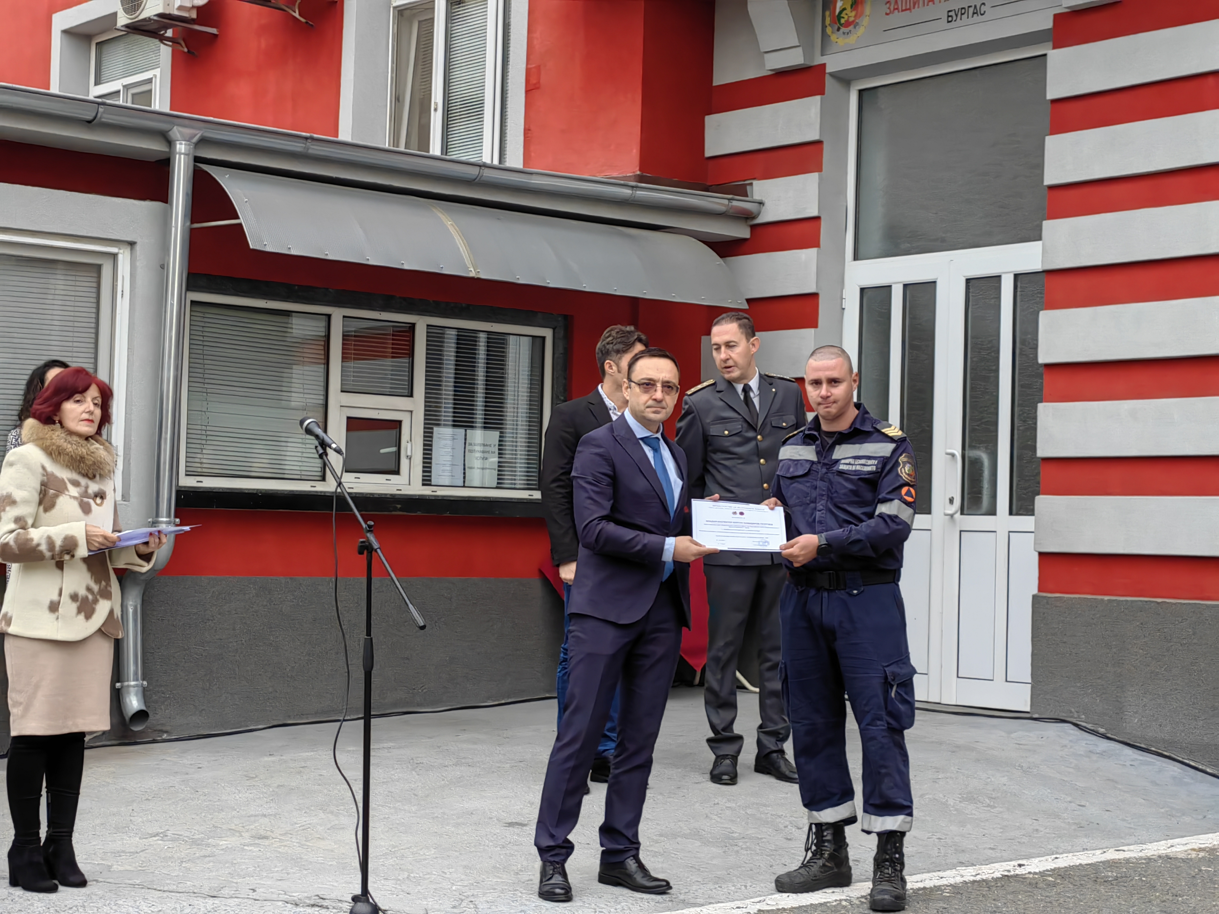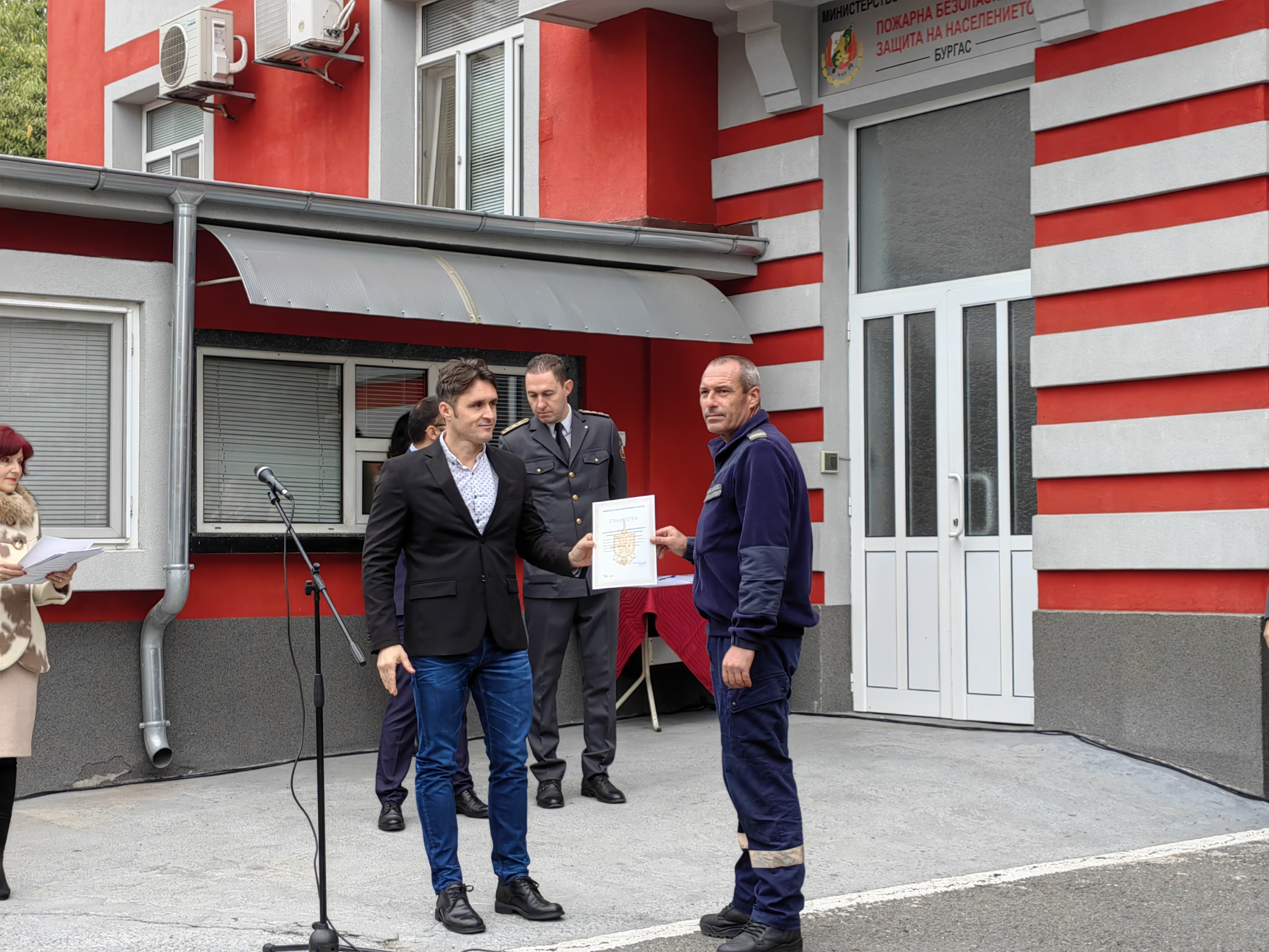 Грамотите си огнеборците получиха от главен комисар Александър Джартов – директор на ГДПБЗН-МВР, и старши комисар Емил Павлов – директор на ОДМВР-Бургас