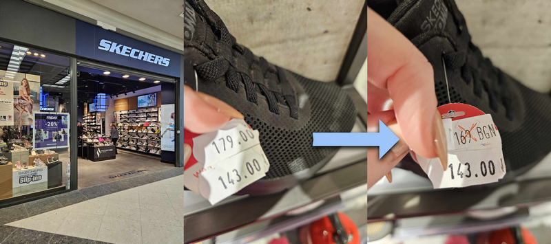 В един от спортните магазини репортерът ни забеляза, че отстъпката на витрината е манипулирана чрез преправени цени. Обявеното „намаление“ реално е по-малък процент от посоченото на етикета. След внимателно отлепяне на етикета, отдолу прозира друга – по-ниска цена, от първоначалната обявена в момента. Мъжките маратонки преди седмица са стрували 169 лв., днес официалната им цена е 179 лв. и след направено намаление цената в крайна сметка става 143 лв. Реално намаление има, но то е с по-малки проценти от обявеното.