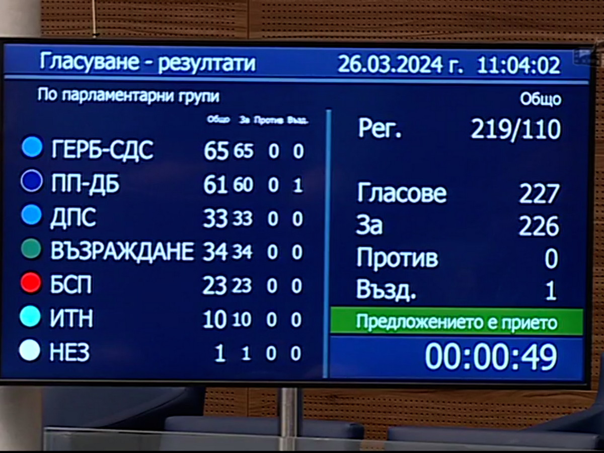 226 депутати гласуваха „за“ отказа на Мария Габриел да предложи проектоправителство. 1 бе „въздържал се“ - представител на ПП-ДБ.