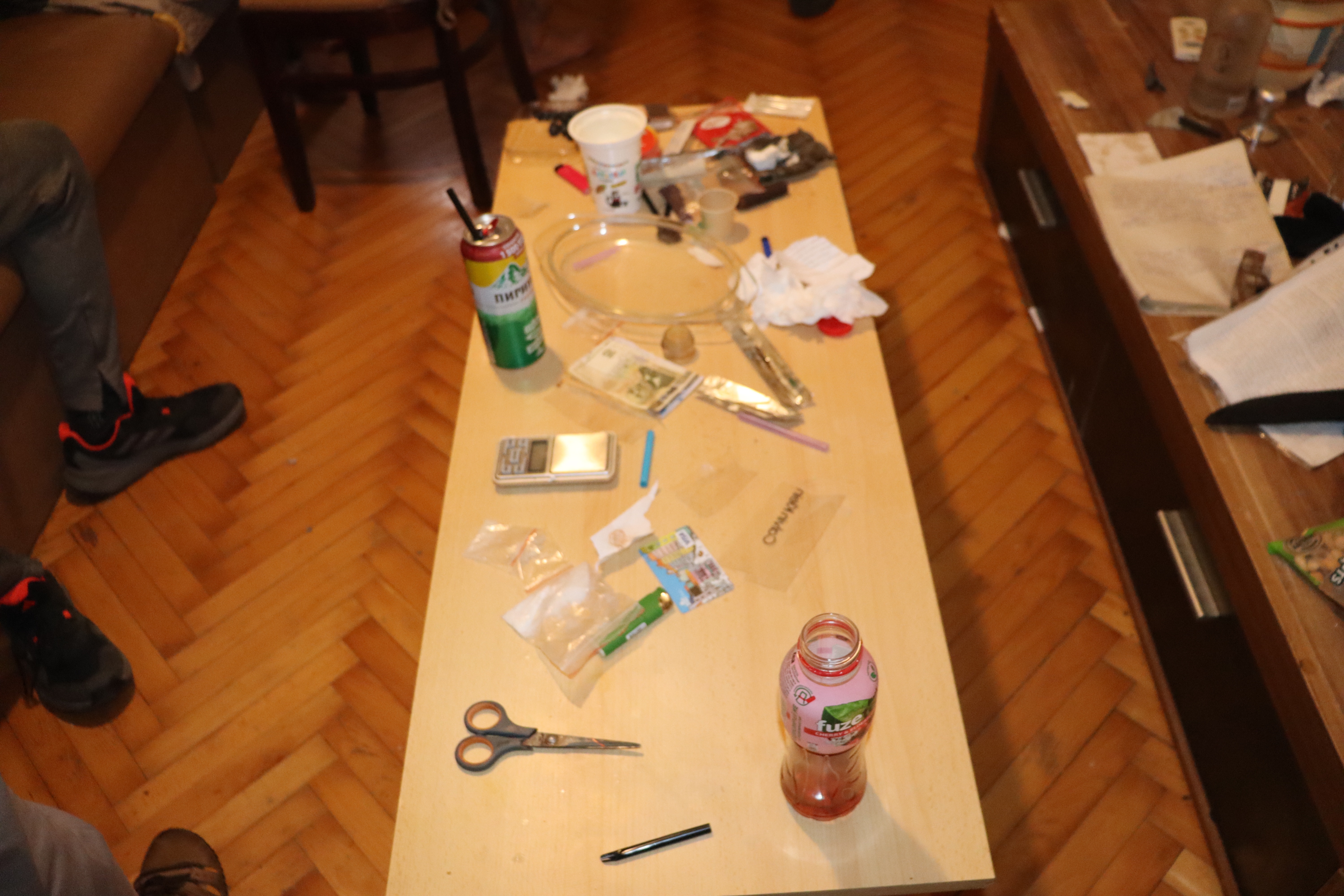 Открита са и множество бутилки с течност със силна задушлива миризма на ацетон, стъклени колби, фунии, таблетки, червен фосфор, вентилатор и стъклен капак със засъхнало кристалообразно вещество, реагирало при направения полеви наркотест на метамфетамин.