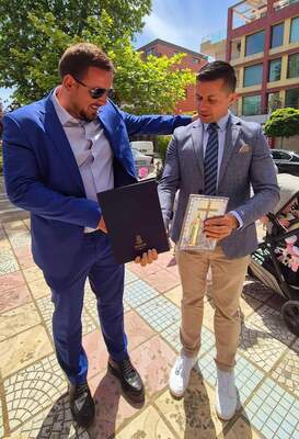 “Приморско за нас е братска община, пожелавам ти да развиеш и града и другите населените места, да имаш същата воля и желание и след няколко мандата”, заяви Марин Киров, който подари икона на Св.Св. Константин и Елена и връчи официален поздравителен адрес на колегата си.