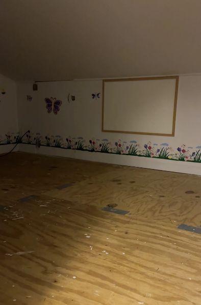 В една от стаите жената се натъкнала на странна малка врата, която се намирала на височина метър от пода. Зад вратата имало малко тайно помещение, наподобяващо детска стая, с много ниски тавани. Стените му били покрити с тапети на цветя, а дървеният под бил скрепен с железни скоби.