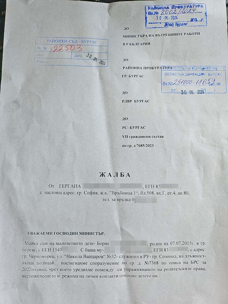 „Писах му преди една седмица, че излизам в отпуск и ми се полага да взема детето. Той каза да дойда на 3 юни и тогава ще ми го даде и ще го гледаме седмица за седмица. Много пъти обаче идвам да го взема и той отказва, подали сме не знам вече колко жалби, че ни заплашва, че ще ни ликвидира. До този момент полицията в Бургас не взема никакви решения. Камо ли там, където той работи“, каза Гергана Стоянова.