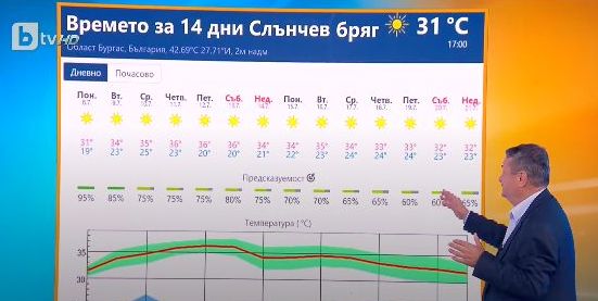 „От петък започва наистина турбожегата. И в събота, и в неделя времето ще бъде много, много топло. Ще дойдат и екваториалните нощи, когато рано сутрин, преди изгрев слънце, температурите ще бъдат над 25 градуса“, заяви климатолът.