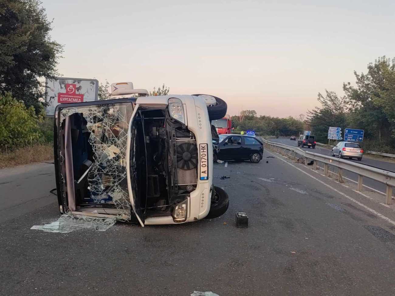 Тежка катастрофа до кв. Kрайморие! Автобус се обърна, пътници са в болница (СНИМКИ/ВИДЕО)
