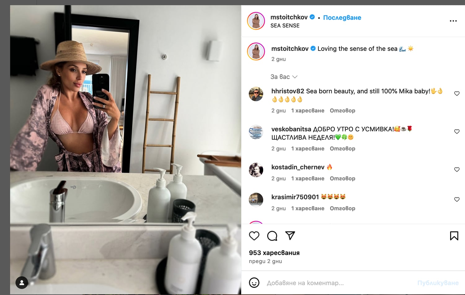 Голямата дъщеря на Камата сама разкри локацията на събитието, публикувайки своя снимка в instagram. На кадъра Мика позира с изрязан секси бански с марка Fendi, който изпъква на загорялата ѝ кожа, a от раменете ѝ царствено се спуска още по-марковото парео на Dior.