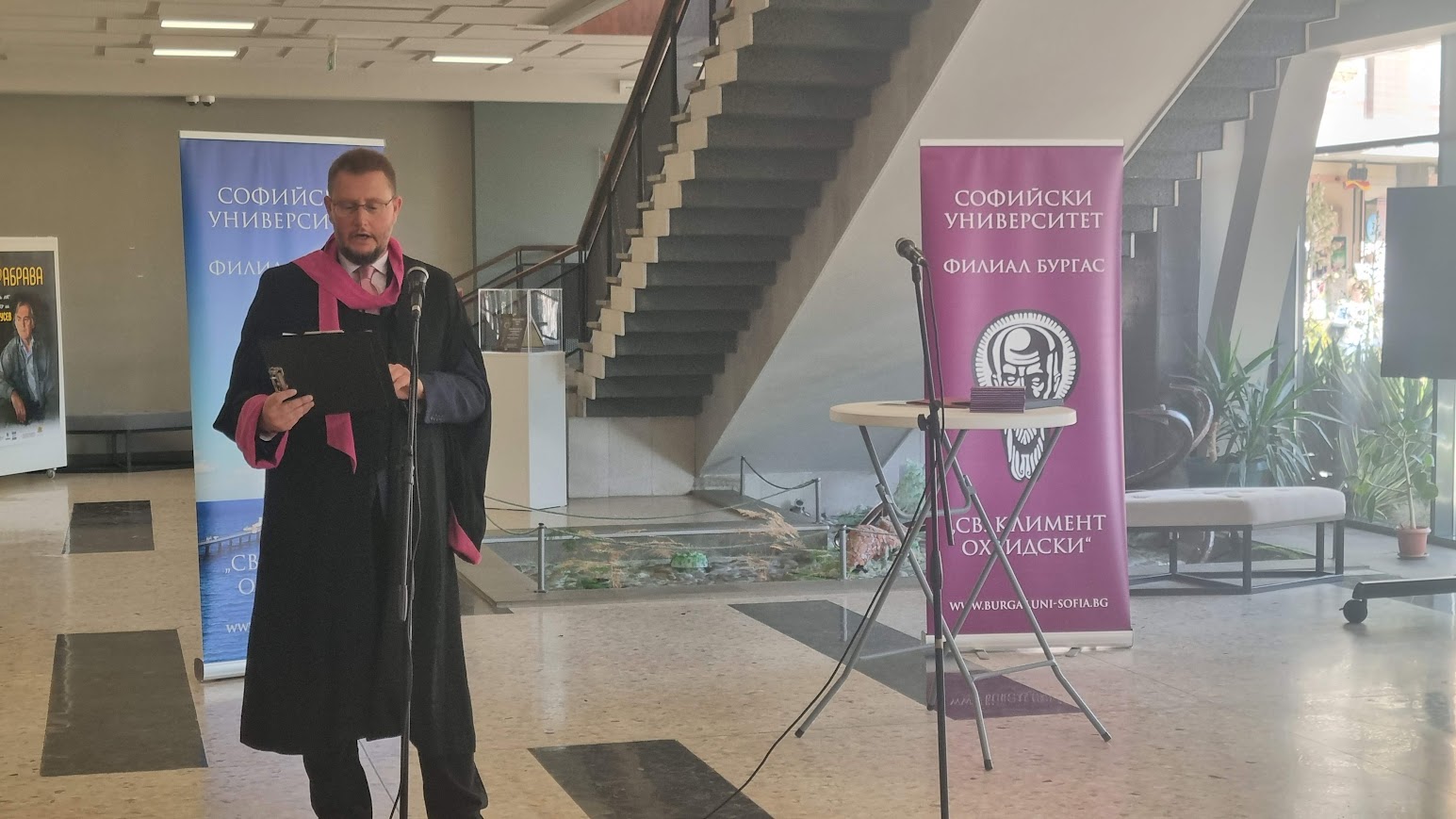 Музикален поздрав отправиха и студенти и преподаватели от специалност „Мултимедийни технологии и тонрежисура“. Събитието уважиха проф. Милен Замфиров – декан на Факултета по науки за образовнаието и изкуствата, декана на Богословски факултет доц. д-р Ивайло Найденов, преподаватели на Софийския университет, представители на висшите учебни заведения в Бургас, директори на училища, общественици, представители на културните институции в града.