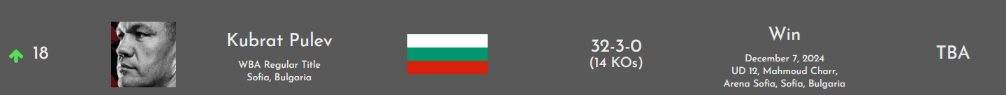 Кубрат Пулев победи Махмуд Чар в мач в "Арена София" и спечели Регулярната световна титла на WBA в тежка категория. В дивизията има супер шампион, а именно Олександър Усик. Неговият колан в "кралската" категория на WBA е с по-голяма тежест.