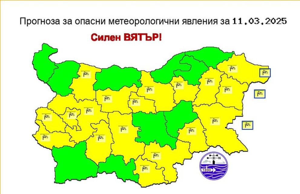 Обявиха жълт код за силен вятър в 18 области у нас – София, София-област, Кюстендил, Перник, Враца, Ловеч, Габрово, Велико Търново, Търговище, Шумен, Варна, Добрич, Бургас, Ямбол, Хасково, Кърджали, Пловдив и Пазарджик.